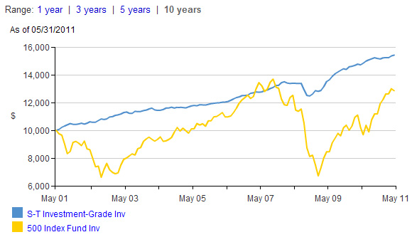 • High-quality corporate Bonds: These have recently delivered a 4-5% return and yet are much less jumpy than stocks. Take a look at the ten-year performance of a suitable Vanguard Bond fund (VFSTX) compared to my favorite big US index fund (VFINX):