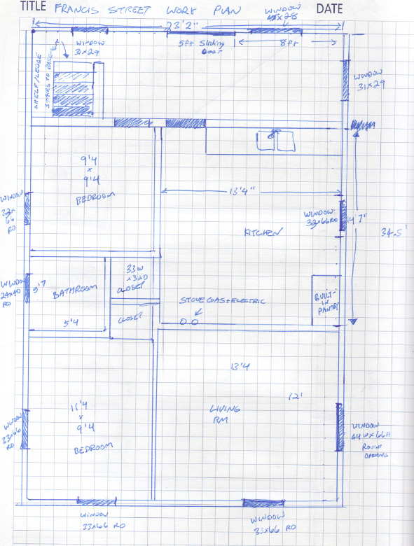 Once I have a sketch, I like to walk through and make a list of what needs doing. Then I type the list into a spreadsheet, and make some conservatively high estimates on the labor and materials to figure out the total time and cost of the project. The simple spreadsheet linked above tells me that we’re going to spend about $13,700 on the carpentry and materials portion of this remodel (including new kitchen appliances), which leaves about $12k for painting, landscaping, and other tasks if we want to stick to the original $25k budget. We did score an additional $1500 off of the purchase price from the bank, which adds to the safety margin of this project. Getting good estimates is pretty important, especially for renovations larger than this one. Since I’ve done all of these tasks many times over the years and always keep spreadsheet records of how long things take, I find that my time estimates are pretty good these days.