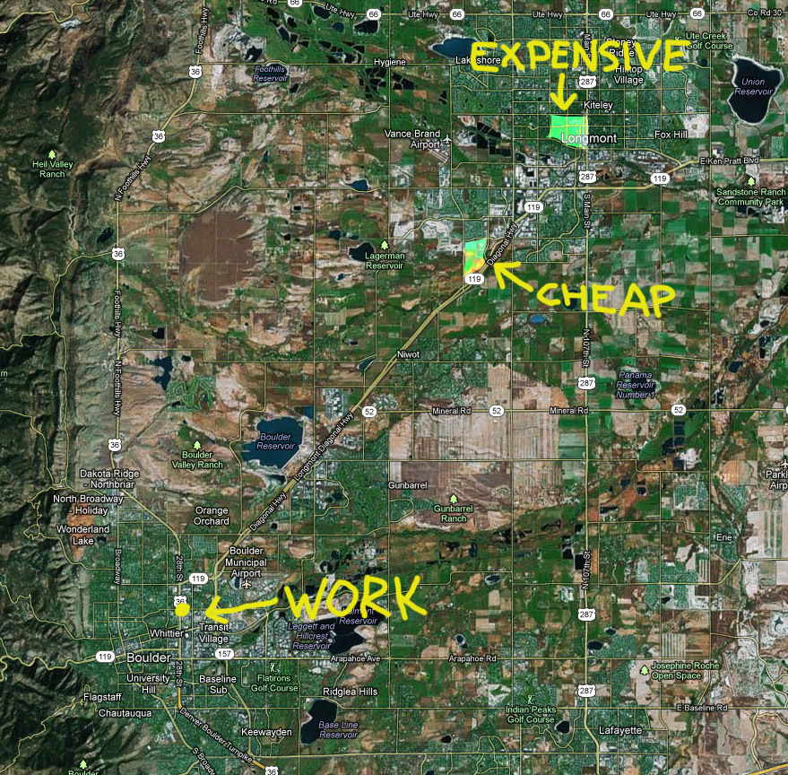 Here we have a map of my town, Longmont, relative to Boulder. At the closest point, the cities are about 10 miles apart. But if you live in the downtown area where I live, you have to poke along for 12 minutes through traffic lights and other junk even to get to the Southwestern edge of town, where the road to Boulder begins. On top of that, the houses downtown are expensive, while you can get large, well-built modern houses down at the corner, still within easy biking distance of grocery stores and schools, at a much lower cost.