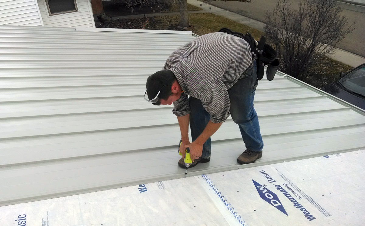 Here I am doing the most time-consuming task: screwing down every panel, every 24". The line of screws is then hidden by the overlapping seam of the next panel, which locks in.