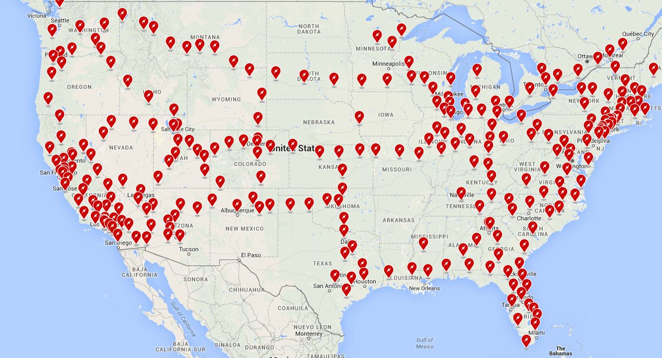 This is Tesla’s network of free charging stations as of April 2016. More are going in every day, but in a pinch you can always use one of the other 27,000 or so public electric car charging stations that have sprung up, or charge at home. For comparison there are 168k gas stations in this country.