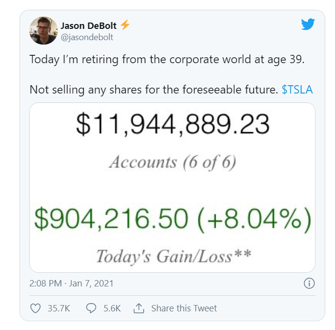 Congratulations Jason! As someone who retired 16 years ago at age 30, I’d suggest some diversification. Why bet everything on such a volatile rocket ship, when you’re already set for life many times over?
